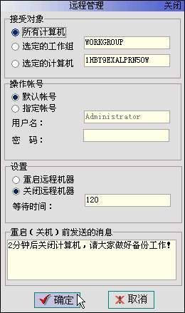 超级网管还提供了“远程管理”功能,它可以对局域网内的所有客户机进行远程关闭和远程重启。