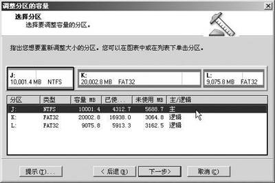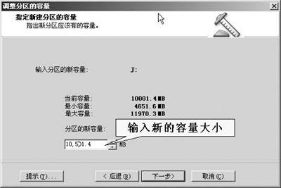 在接下来出现的对话框(图3)中会显示出当前硬盘容量的大小以及允许的最小和最大容量。你可在“分区的新容量”处的数值框中输入改变后的分区大小。注意最大值不能超过上面提示中所允许的最大容量。然后在下一个对话框中选择要减少哪一个分区的容量来补充给所调整的分区。
