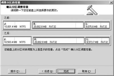 最后需要确认在分区上所做的更改。在对话框(图4)中会出现调整之前和之后的对比,在核对无误后就可以点击“完成”按钮回到主界面。