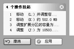 以上的操作还只是对分区调整做了一个规划,要想让它起作用还要选择左边栏下部的“应用”按钮(图5),此时会弹出一个“应用更改”对话框,选择“是”,即可开始进行调整,此时会弹出“过程”对话框(图6),其中有三个显示操作过程的进度条,完成后重新启动计算机方才大功告成。