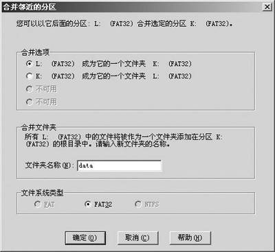 在PartitionMagic主界面中选中要合并的分区,然后单击鼠标右键,在弹出的快捷菜单中选择“合并”命令,会打开“合并邻近分区”对话框(图7)。先在“合并选项”栏中选择要合并的分区,然后在“文件夹名称”处指定用于存放合并分区数据的文件夹名称(如果要把两个分区合并成为一个分区,参加合并的其中一个分区的全部内容会被存放到另一个分区的指定的文件夹下面)。最后单击“确定”。