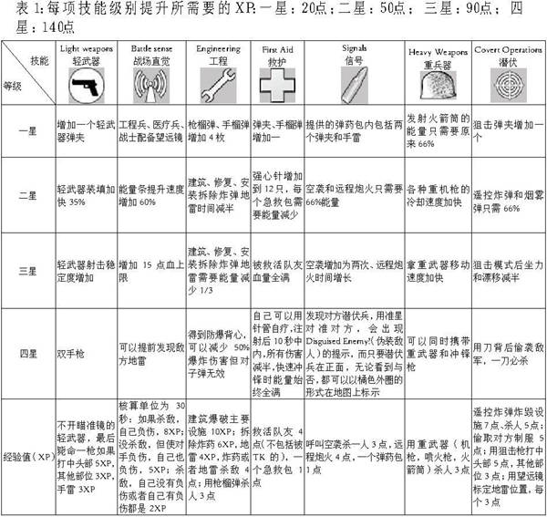 技能一共包括七项,其中Light Weapons(轻武器)和Battle Sense(战场感觉)是每个兵种都必须修炼的,其他每项技能都和兵种的特性有关系(见表1)。