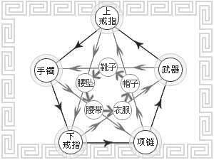 首先,让我们来了解一下游戏中装备五行相生激活系统。装备共有十种,分别是:武器、衣服、项链、护腕、上戒、下戒、帽子、靴子、腰坠、腰带。每件装备都有一个五行属性,金木水火土其中随机的一种。而有的高级装备,除了基本的攻防属性之外还有高级属性,在这些高级属性中有的还是暗藏属性,以灰色显示。这种属性在一般情况下是不会发生作用的,只有在金生水、水生木、木生火、火生土、土生金的规则下被激活。每件装备的暗藏属性最多有三个,而激活装备属性的方法也有三个,但一个方法只能激活一种属性。因为人物本身有五行属性,所以自身属性相生的属性装备可以被激活,这是方法一。金山的设定中,装备有着横纵两个循环圈(如图),这两个循环圈构成一条链,在这条链中的前一个装备的五行属性能够激活后一个装备,此为方法二。