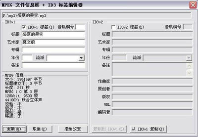 什么是音乐文件信息?一般音乐格式都有个“头文件信息”,这里储存了该音乐的版权、定义、演唱者和所属专辑等。目的就是能够更好地管理多媒体音乐。很多多媒体管理软件也就是借助这个音乐文件信息来自动管理大量的音乐文件,而这些音乐文件信息都是可以自己修改和编辑的。