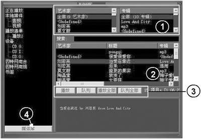 ③这里是控制文件播放的基本按钮,其中的“队列”可以把你选择的歌曲暂时加入到主界面的播放清单窗口中以待播放。