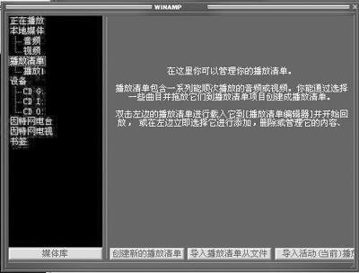 一张清单可以记录同种类型的歌曲,一切都可以按你自己的意思来定制。这样以后你只需要调入播放清单便可播放里面记录的歌曲。在媒体库中,点击“播放清单”会出现如图7所示的界面,你可以创建新的播放清单、导入以前已经有了的播放清单或保存正在播放清单编辑器中的清单列表。