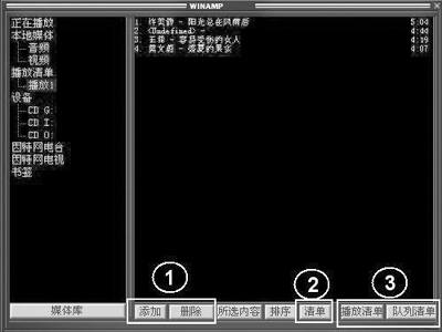 ③点击“播放清单”,Winamp会自动播放清单中的多媒体文件;点击“队列清单”,Winamp会直接把你选定清单中的文件加入到正在播放的清单中。