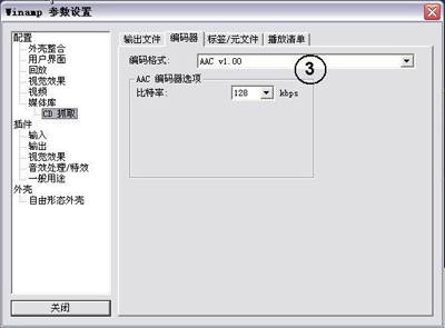 提示:如果想保持抓取音轨后音色不会有太多的损失而且文件体积不会太大,这里建议把编码格式选择为“ACC”格式,下面设置的比特率越高损失越小,当然最后得到的文件也会越大。当然,Winamp不会只提供两种编码格式,你可以在媒体库中的选择“设备”界面上,通过点击“获取插件”来增加编码格式。