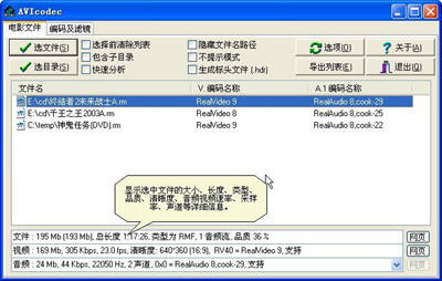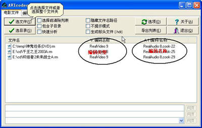 步骤1:如图1所示,在AVIcodec主界面中点击“选文件”或者“选目录”来添加影片文件或者文件夹中所有的文件。添加后即可在窗口中显示所选择文件的文件名、视频编码名称、音频编码名称。