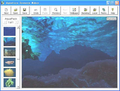 现在,我们可以随意将“AquaPack”视图中的珊瑚、海草等海洋生物拖曳到背景层中,以作点缀。如果你希望将硬盘中的海底景物图像添加至此,可点击“Layer”按钮导入其中。下面我们看看如何对这些背景层的物体进行控制。