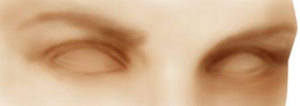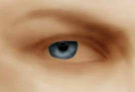 5.用喷枪画出眼白,这时候的眼睛看起来还是木呆呆的,所以 接着就要开始深入细节的工作了。用喷枪把眼皮和眼睑颜色加深,因为画的是外国人的眼睛,眼窝特别凹陷,眉弓则突出,所以眼窝处的阴影重。用画笔工具画出双眼皮的厚度,注意一些细节的变化,用稍大的笔刷,就像女孩子画眼影似的从眼角处向斜上方刷。下眼线可以用减淡工具提亮。点出高光,现在眼睛神气多了吧(图5)。