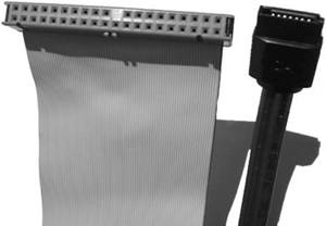 相对于老式的并行ATA标准,Serial ATA(串行ATA,简称SATA)标准是一种新型接口标准,如图1,SATA与IDE接口,图2,SATA接口线与硬盘线。SATA可以应用于硬盘、光驱等存储设备中,并会逐渐取代传统的并行ATA连接方式。与并行ATA相比,SATA拥有许多优势:设计简单,每条通道只需要4个信号针脚;数据传输速率也比ATA高;具有热插拔功能;在不受Master和Slave限制的情况下可以连接数量更多的硬盘。SATA 1.0定义的数据传输速率就达到150MB/s,比目前最新的并行ATA(Ultra DMA/133)的133MB/s还要高,而在Serial ATA 2.0标准中,数据传输速率更是高达300MB/s。这样看来,与传统的并行ATA相比,SATA的优势非常明显,是一种很有前途的总线接口标准。