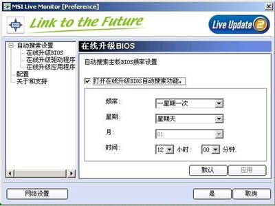 微星推出的Live Update 3工具功能强大,不仅支持微星主板和微星显卡的在线升级,还可以支持微星光存储产品的固件线上升级。微星Live Update 3的操作非常简单,为图形界面模式,用户在Windows环境中通过网络就可自动寻找并下载微星硬件产品相应的最新BIOS程序,而用户只需依提示就可完成BIOS升级。此外,Live Update 3还可以设定BIOS定时自动检测升级(如图1),下载地址为http://cweb.msi.com.tw/html/support/liveupdate/main.htm