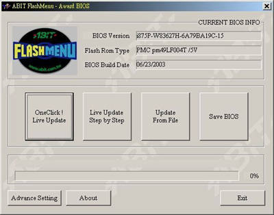 FlashMenu是升技近来推出的Windows下在线更新BIOS的工具(如图2)。FlashMenu有两个方法让我们方便升级BIOS,第一是“One-Click Live Update”即一键更新,只需点击鼠标就可以通过网络下载最新的BIOS,然后刷新并自动储存老的BIOS。第二是“Live Update Step by Step”功能,它可以让用户选择希望更新的BIOS,并将老BIOS存到指定的位置。当然,你也可以选择第三项的“Update From File”,选择已经下载到本地硬盘上的BIOS文件进行BIOS刷新。最新版本的FlashMenu下载地址为http://fae.abit.com.tw/eng/download /dl_flashmenu.htm