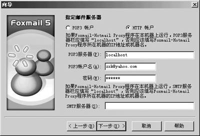 对于支持POP功能的雅虎邮箱,如yahoo.com.cn等,建立账号时,向导会自动为你加上POP/SMTP服务器地址,而对于美国雅虎(yahoo.com)等不支持POP方式的邮箱,在创建账号时,向导会以HTTP协议方式通过Foxmail-Hotmail Proxy来收发(图2)。