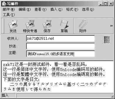 而这次Foxmail5.0支持的Unicode使得同一个邮件内,可以显示和编辑不同国家地区的语言文字。例如,当你在简体中文系统中回复一个繁体中文或者日文的邮件时,原邮件的文字与你要输入的简体中文都可以正确地显示在一起,不会出现乱码(图3)。