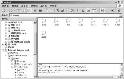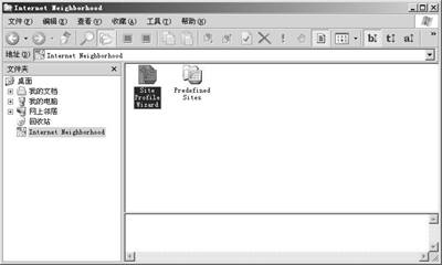 安装完成后,重新启动计算机,打开资源管理器,你会发现左边“文件夹”列表的最下方增加了一个启动FTP软件的选项“Internet Neighborhood”,在其上单击鼠标,即可切换到FTP工作状态,这时资源管理器的工具栏上会增加FTP操作相关的工具按钮,而右边窗口空白处则会出现两项命令:“Site Profile Wizard”和“Predefined Sites”,选择前者可以添加新的FTP站点,选择后者可直接使用软件内置的FTP站点(图1)。