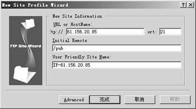 在“Site Profile Wizard”命令上双击鼠标,打开对话框(图2),在“URL or HostName”下方的输入框中输入FTP站点的IP地址或主机名,格式为“61.156.20.85”或“ftp.blizzard.com”,“ort”为FTP服务器的服务端口,一般情况下是21,“Initial Remote”可留空或输入“/pub”,这需要视不同的FTP站点而定。如果这个FTP站点允许匿名登录,现在点击“完成”即可添加完成。不过也有很多站点在访问时需要验证用户名和密码,这时可单击“Advanced”按钮,然后去除“Login as Anonymous”前的复选,即可在“Username”和“Password”中设置用户名和密码。