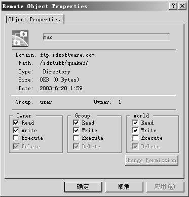 如果你本人就是一位FTP站点管理员,你也可以直接用它对FTP服务器上的文件或文件夹进行删除、重命名、更改属性等操作,而操作方法也和资源管理器非常类似,通过文件或文件夹的右键菜单即可完成。在文件的右键菜单中选择“Properties”,可打开如图4所示的对话框,你还可以更改不同用户对此文件的操作权限。