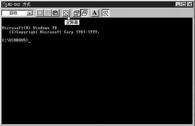 这是因为在使用“MS-DOS方式”的时候,误点击了窗口工具栏上的“全屏幕”按钮(如图所示);或者可能是在“MS-DOS方式”的“属性”窗口中,通过“屏幕”选项卡设置了“全屏幕”窗口方式;也可能是不小心按了键盘的快捷键造成的。比如在命令行状态下,输入命令的时候按了“Alt+Enter”组合键。