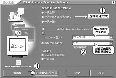 ①、②对照片传送方式、传送文件夹等项进行设置。