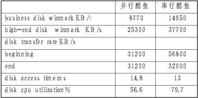 Winbench99能够对磁盘性能做全面的检测。从磁盘传输曲线可以看出并行酷鱼的传输速率非常稳定,传输曲线几乎成一直线,保持在31.2MB/s的水平,而串行酷鱼则从56.8MB/s梯次下降到32MB/s。不过即使是串行酷鱼的最低传输速率也较并行酷鱼为高。Business disk winmark模拟用户在商业应用的使用环境下,测试这时硬盘的传输速率,而High-end disk winmark模拟高端用户的使用环境,运行Premiere、Photoshop、VC等程序,测试磁盘传输速率,两项测试中,串行酷鱼的性能比起并行酷鱼的有超过50%的提升。磁盘寻道时间串行酷鱼也比并行酷鱼要少,只是CPU占用率比并行高出不少。