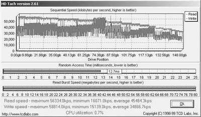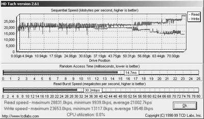 HD Tach的传输速率曲线印证了Winbench的传输曲线。并行酷鱼的读、写曲线上下波动非常小,传输速率比较稳定。而串行ATA酷鱼的读取速率比较稳定,而写速度起伏就较大了。在传输速率和平均寻道时间上,串行酷鱼同样保持了领先的优势。