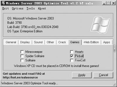由于Windows Server 2003是为服务器而开发的,因此并没有提供Windows XP中的游戏组件,虽然都只是一些小游戏,但总觉得少了些什么似的。现在好了,只要在“Games”选项卡中将喜欢的游戏选中,然后点击下面的“Apply”按钮,接着会要求你插入Windows XP安装光盘,按照提示操作即可(图3)。