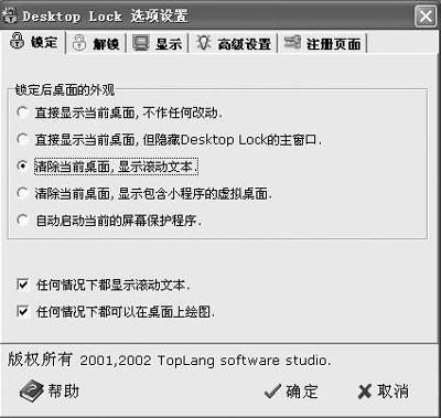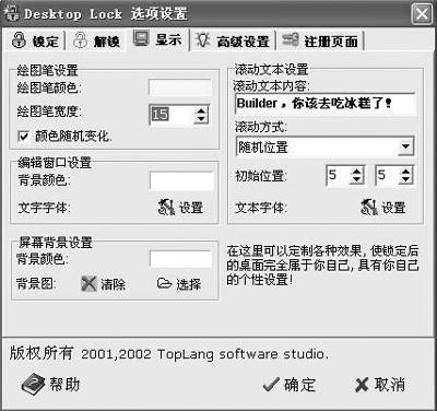 在“锁定”选项卡中,你可以设定五种锁定后的桌面效果(图1),如“清除当前桌面,显示滚动文本”等,并可在“显示”选项卡中定制它们的细节,如滚动文本的具体内容、滚动的方式、文本的初始位置、文本的字体样式和大小以及锁屏后的屏幕背景图(图2),这里也是你显示个性的地方,想怎么设置,就看你的喜好了。