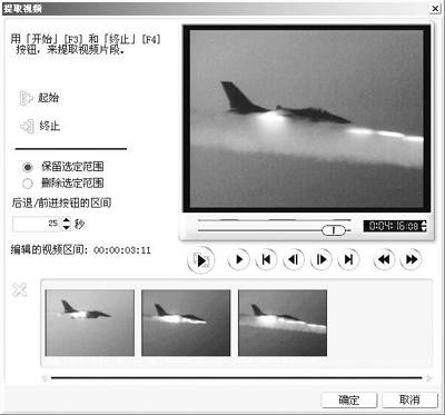在时间轴上选择要修剪的片段,然后点击“视频”面板中的“提取视频”,会弹出“提取视频”对话框(图3)。如果是选取要保留的片段,可选定“保留选定范围”单选框,否则就选择“删除选定范围”。先点击预览窗口处的播放按钮,到了要保留的部分按下F3键,完成后按F4键。如此可选定多个片段,完成后你就可以在故事板中看到原始素材已经被分成多个片段了。