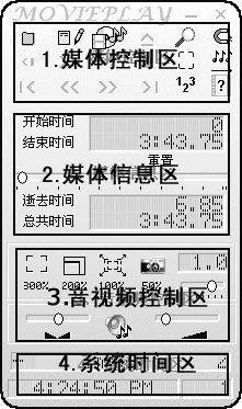 MoviePlay主界面可以分为4个部分(图1)。其中第1部分是媒体选择、播放、快退、快进等操作区,程序支持一次打开多个文件及播放列表的播放;第2部分是媒体播放的时间显示区。第3部分是用来调整播放画面大小、播放速度、声道选择、音量大小等控制区。最后一部分是用来显示当前系统的日期、当前系统时间等信息。