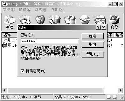 以WinZip8.1为例,它可以对压缩包进行加密,方法为:打开一个需要加密的压缩包,选择“选项→密码”命令,在弹出的窗口中输入密码(图2),点“确定”即可。对于新添加的压缩包,可以单击“添加”按钮,在弹出的窗体中点“密码”按钮进行设置。