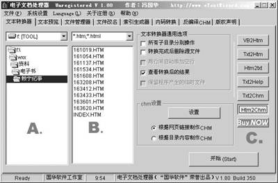 2.接下来将它们放置在同一文件夹下。在如图所示A区选择路径,在B区就会看到所有的文件。这时在C区选择“Htm2Chm”,即将HTML文件转化为CHM文件。可以看到,在B区将显示所有符合要求的文件,且笔者将要编译的文件组是由一个INDEX文件和其下属的一组HTML文件组成的。