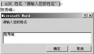 操作:在文档中插入两个域:{ASK 姓名 “请输入你的姓名”}、{REF 姓名},选中前一个域,右击鼠标,在随后弹出的快捷菜单中,选“更新域”选项,则弹出如图所示的对话框,输入相应的内容后,再选中后一个域,切换到域结果状态下,即刻显示出上述填入的内容。