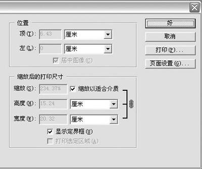 对于一些尺寸过大,从而不能整张打印的图片,可以采用PS的“缩放以适合介质”功能,使得在较小的纸张上打印较大的图片,而且比例不失调。使用的方法是执行“文件→打印选项”命令,然后在弹出的“打印选项”设置窗口中,将“缩放后的打印尺寸”下面的“缩放以适合介质”选项选中,单击“打印”按钮就可以了(如图)。在设置缩放比例的时候,可以根据自己的需要在“缩放”框中输入自己需要的比例或者输入“高度”和“宽度”值,精确缩放图像。使用这种方法,也可以将较小的图片,经过缩放后,打印在较大的纸张上,而且撑满整个页面。