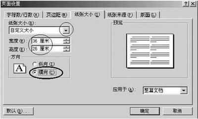 办公室配上A4幅面喷墨打印机已是平常事,但打印8开或A3幅面纸张的材料时就犯难。普通的办法都费时费力又达不到省钱的目的。现在介绍一种既省力又能省钱的方法,请跟笔者一起来设置并操作:单击“文件”菜单中的“页面设置”命令,打开“页面设置”对话框,如图所示。再单击“纸张大小”标签,又单击“纸张大小”列表框下拉按钮,选定“自定义大小”,并在“宽度”文本框中输入“36厘米”,在“高度”文本框中输入“26厘米”。还要将“方向”中可选的“纵向”改为“横向”(注意,此步是关键,若不改,则不能打印8开纸)。然后在“字符数/行数”标签中的“栏数”文本框中输入“2”(以上是在Word 97环境下操作的,若在Word 2000环境下,则有下列变化:“纸张大小”标签变为“纸张”标签;“纸张大小”列表框变为“纸型”列表框;“字符数/行数”标签变为“文档网格”标签;“方向”则变到了“页边距”中。至于操作是完全相同的)。按“确定”按钮即完成“页面设置”工作,剩下的就是打开打印机准备打印了。当然了,为了能打印8开的内容,放纸时也是与正常打印不一样,正常打印8开纸时,是长边放入,而此时应把短边先放入,何况长边也放不入A4打印机。