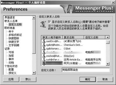 由于MSN Messenger允许有非常长的昵称,许多朋友都喜欢不停地变换个性化的昵称,甚至一天都要换几次,让人弄不清楚到底谁是谁。现在有了Messenger Plus,你可以像QQ一样自己定义好友昵称,无论对方昵称怎么变,你都能通过自定义的昵称认出他。