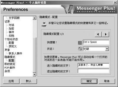 然后单击左边的“配置”,这里可以配置3套不同的隐藏方案,每套方案可以自行设置快捷键和在线状态(图3),单击左右箭头按钮可以切换不同的配置方案。设置完毕后,当你按下指定的快捷键时,所有打开的MSN Messenger聊天窗口和主窗口都会被关闭,同时系统托盘中的图标会变成前面选择的图标,而且在配置中的“进入隐藏时的文字”栏中可以输入一段文字,例如“老板来了,待会儿再聊”,这样在进入隐藏状态时,可以自动给所有正在聊天的好友发送这个消息。如果要退出隐藏模式,双击系统托盘中修改后的MSN Messenger图标即可。