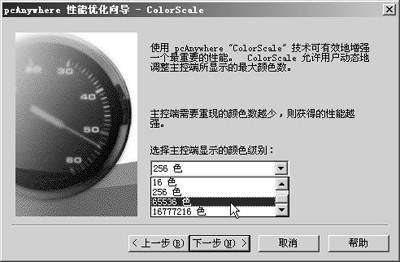 在主界面窗口中,执行主菜单“工具→性能优化向导”命令,弹出“性能优化向导”对话框,单击“下一步”按钮,弹出“ColorScale”设置界面。这里需要设置被控端电脑的屏幕颜色级别,适当地降低显示颜色数可以提高远程控制的性能,系统默认值是256色。如果你的网络连接速度较快,可以将它设置得更高一些,比如16位色或者32位真彩色(图2)。
