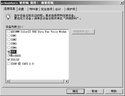 如果打算根据自己的需要设置远程连接,可以双击“添加被控端”图标,弹出被控端设置对话框。打开“连接信息”选项卡,在“设备列表”中选择远程连接方式,比如通过调制解调器和TCP/IP协议;如果要通过局域网或者互联网来进行远程控制,可以选择相应的网络协议,比如TCP/IP、SPX协议(图3)。