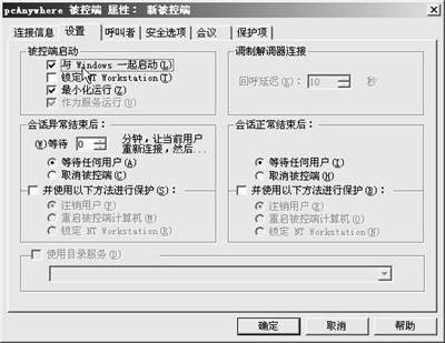 单击“设置”选项卡,可以设置被控端软件的运行状态和远程控制会话时间以及会话之后的结束方式。“被控端启动”选项栏用于在控制端设置好以后,选择是否让pcAnywhere最小化运行、是否运行屏幕保护程序,以及是否在下一次启动计算机时直接启动程序等。在“会话异常结束后”的选项栏中,可以在连接会话不正常的情况下设置是否取消被控端,或是等待多久连接用户(图4)。