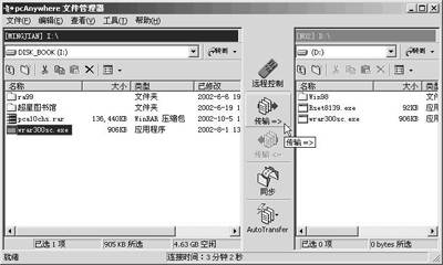 要想在本地计算机和远程计算机之间传输文件,可以单击远程计算机控制界面工具栏中的“文件传输”按钮,打开“文件传输”对话框(图6),在左侧列表中选择需要传输的文件名,然后单击“传输”按钮即可将选定的文件传输到远程被控端计算机了。