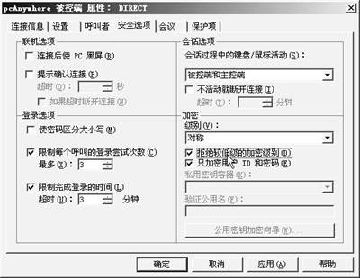 如果要在远程控制中实现加密与安全措施,可以使用对称加密功能。在管理器的窗口中,用鼠标右键单击“被控端”,然后单击“属性”命令打开被控端属性设置对话框,单击“安全选项”选项卡,选择加密级别列表框中的“对称”列表选项。如果要连接的计算机使用的是较低的加密级别,可以选中“拒绝较低的加密级别”选项。如果是被控端用户并希望通过只对主控端用户的身份进行加密来提高安全性可以选中“只加密用户 ID 和密码”(图7)。