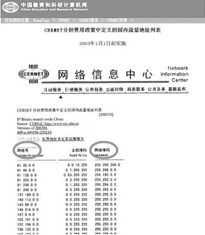 打开IE浏览器,在地址栏中输入:http://www.edu.cn/20021107/3071773.shtml,这是教育网定义的国内流量地址列表,大家可以保存到本地硬盘上备查。列表中有3列,其中“网络号”和“网络掩码”在以下添加IP规则时要用到(图1)。