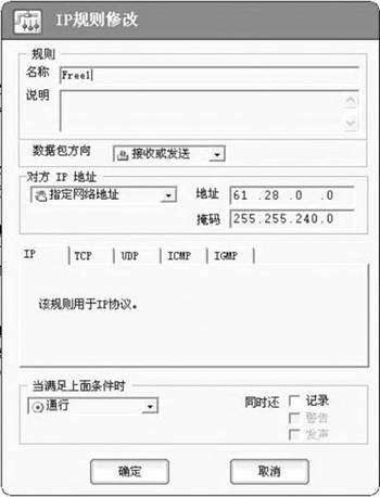 安装好天网防火墙后,打开程序主窗口(图2),点击“自定义IP规则”按钮,会出现相应的窗口。然后点击“增加规则”,出现“IP规则修改”窗口,按照上面保存的国内流量地址表逐条输入。图3为输入第一条的示范,“名称”中输入“Free1”,代表这是添加的第一条IP规则;“数据包方向”选择“接收或发送”,右边的“地址”里输入第一条国内流量地址的网络号“61.28.0.0”,“掩码”里输入相应的网络掩码“255.255.240.0”;点击“IP”标签,使这条规则用于IP协议。
