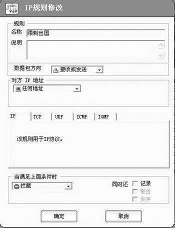 不要以为这样就完成了,还要添加关键的两条规则:“限制出国”和“IP规则”(图4和图5)。“限制出国”这条规则用于阻止免费IP地址以外的连接,“数据包方向”选择“接收或发送”,同样这条规则用于IP协议,应选择满足条件时“拦截”。“IP规则”这条规则其实系统早已默认添加了,你只要在复选框中打上钩就可以了。