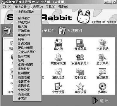 “超级兔子魔法设置”:这里不但集合了该软件所有的优化项目,还有系统的常规优化设置(图3),清晰的图标分类,使操作一目了然,通过菜单命令也可以快速启动优化项目(图4)。这里几乎提供了所有Windows的隐藏参数调整。