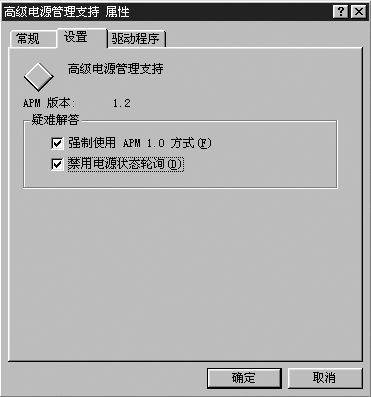 通过“Win+Pause”组合键打开“系统属性”窗口,选择“设备管理器”选项卡,双击“系统设备”,并在列表中双击“高级电源管理支持”,选择“设置”选项卡,并选中“强制使用APM 1.0方式”和“禁用电源状态轮询”复选框(如图1所示),如果没有启用这些设置,请清除复选框。