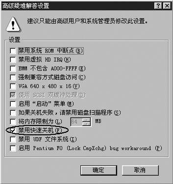 单击“开始”按钮,在“运行”对话框中键入“msconfig”,回车之后打开“系统配置实用程序”窗口。在“常规”选项卡下单击“高级”按钮,在弹出的窗口中选中“禁用快速关机”复选框(如图2所示),单击“确定”,然后再单击“确定”,重新启动计算机后,设置生效。