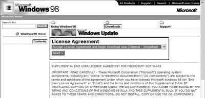 在以上方法都不能解决问题的情况下,我们可以试着给Windows 98安装关机补丁。首先,登录Windows 98第二版关机补丁的下载页面: http://www.microsoft.com/windows98/downloads/contents/wurecommended/s_wufeatured/win98se/default.asp,单击“Next”按钮,之后在“License Agreement”中选择“Accept License Agreement and begin download now(Chinese-Simplified)”(如图3所示),最后单击“Next”按钮就可以下载补丁程序了。双击下载的补丁程序就可以进行安装,在重新启动计算机后完成安装。